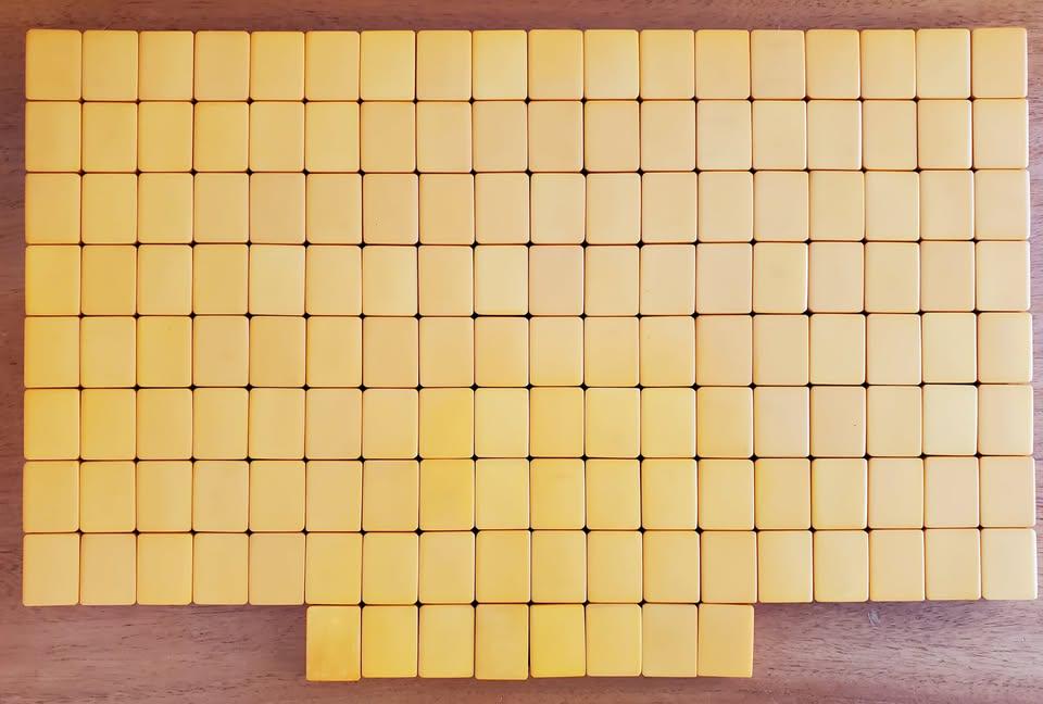 . 152, circa 1940-50s solid Chinese Bakelite tiles. These tiles are hand carved and hand painted. This set features nicely carved tiles. Tiles are in overall nice condition with expected wear. There are some random marks. Four blank tiles and four orphan tiles are stickered as joker tiles with CHarli’s wonderful stickers. The four added tiles are not a perfect match but are close, they have some various marks but do blend in with the original tile set. These tiles have been cleaned by hand. In the photos of the complete tile set, the tiles have been turned over in place. Measurement: Approximately 1-1/8 x 7/8 x 9/16 inches.