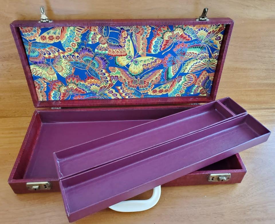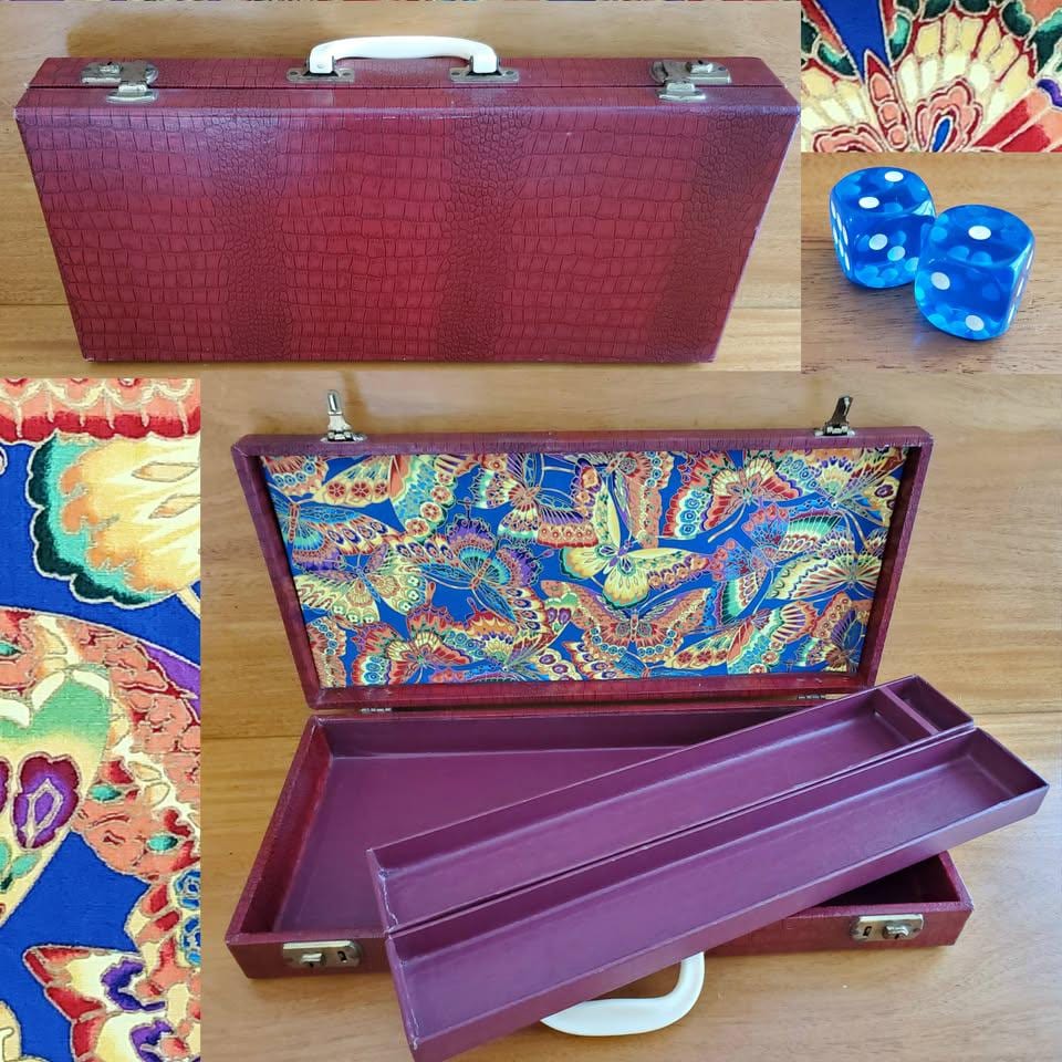 . Vintage, burgundy case in a faux animal print. Two burgundy racks. The case has been newly line in a cotton print with butterflies in shades of blue, yellow, orange, burgundy, purple, green and gold. The case is in nice condition, there are some areas of wear. Gold tone hardware, white handle.