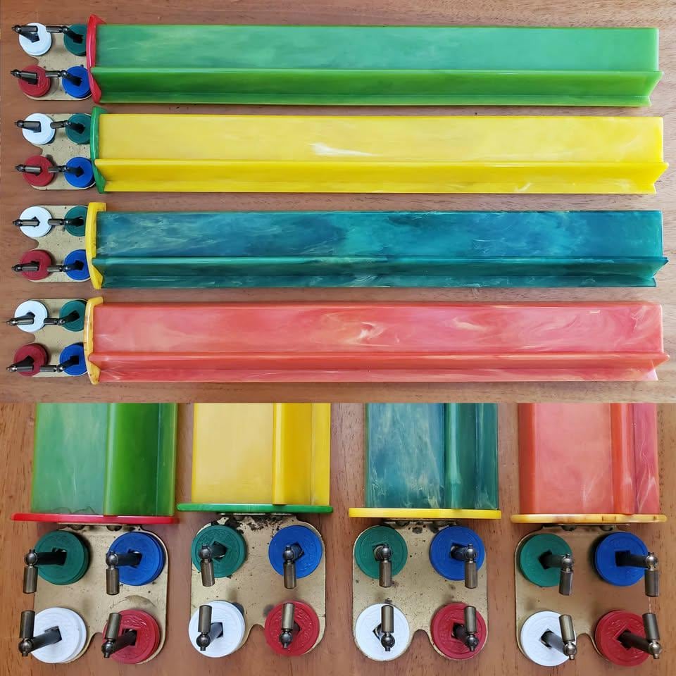 . Vintage, Catalin swirl racks with Catalin swirl stoppers, brass-plated coin holders. There is one each of: pink rack with oatmeal stopper, yellow rack with green stopper, green rack with red stopper and teal rack with oatmeal stopper. The racks have light wear. Coin holders have tight post, they do have wear to the brass plating. Overall, the racks are in nice condition. Measurement: approximately 18-1/4 inches long, 15-3/4 inches playing field.