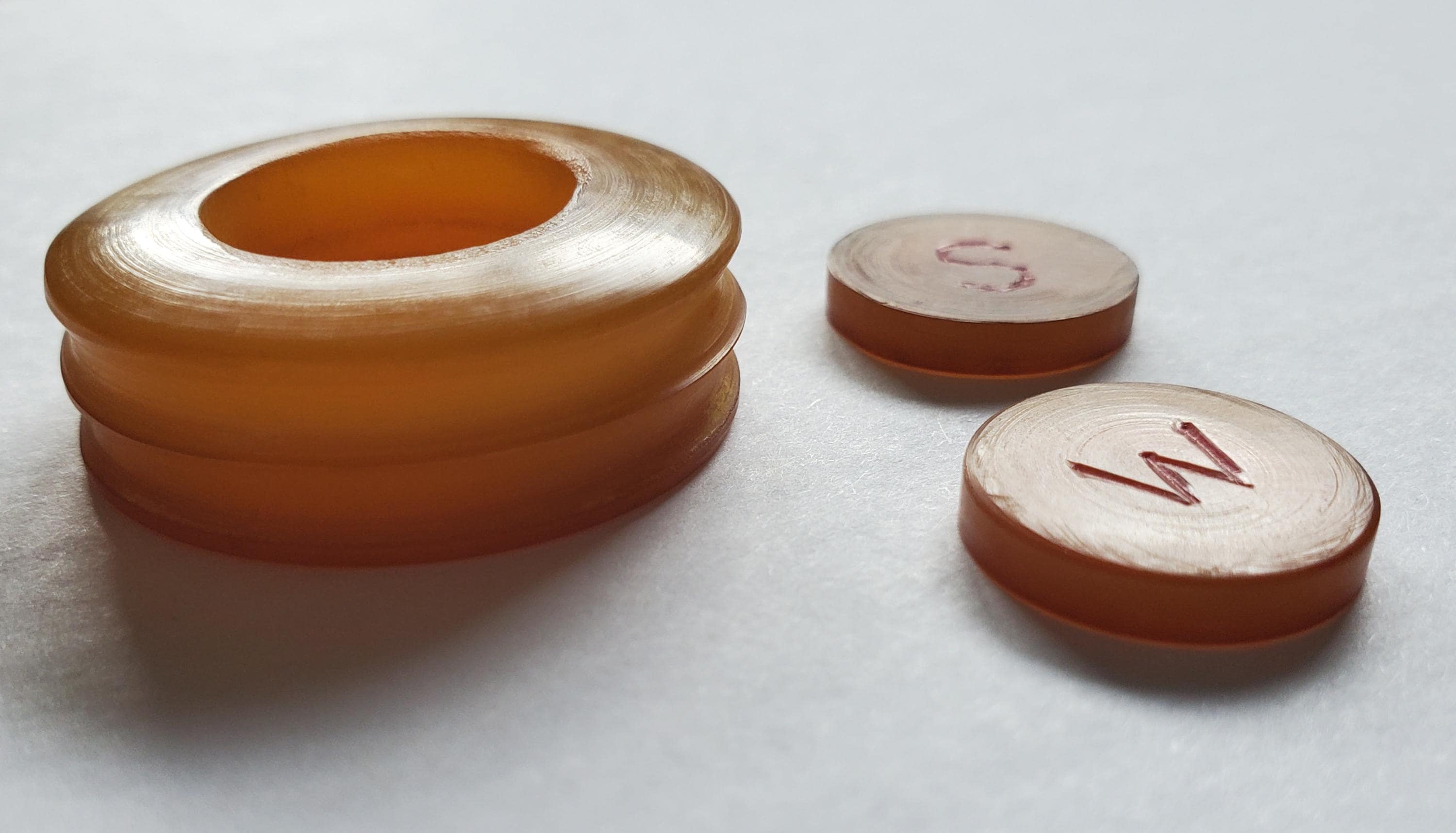 Mid-century, made of translucent apple juice Catalin resin. Wind discs holder with two discs. One disc has an E and S one opposite side, the other discs has an W and N. The letters are painted in red. The discs can be used for E, to show a prevailing wind or as a round indicator. Measurements: Discs holder, 1-1/4 diameter x 3/8 depth inches. Discs, 5/8 diameter x 1/8 depth inches.