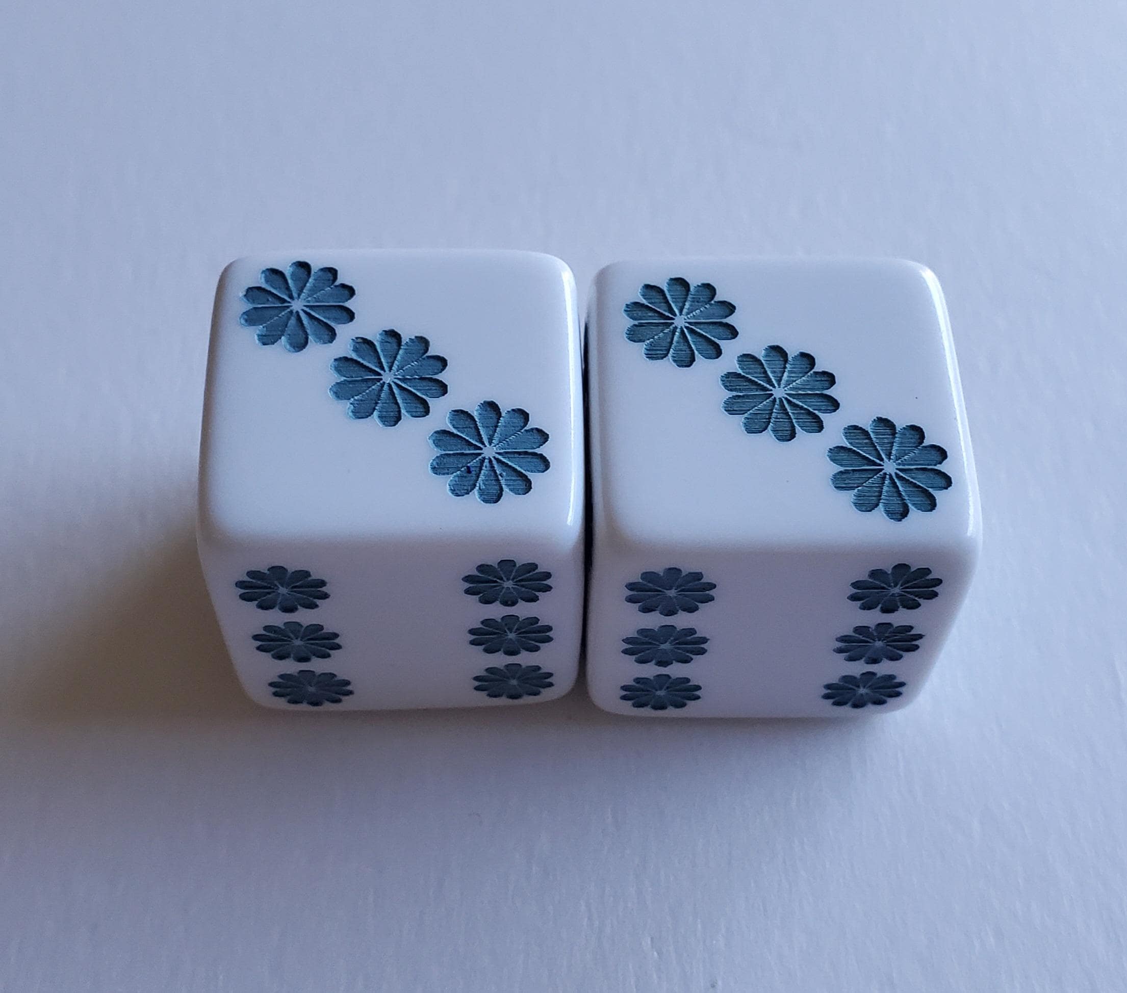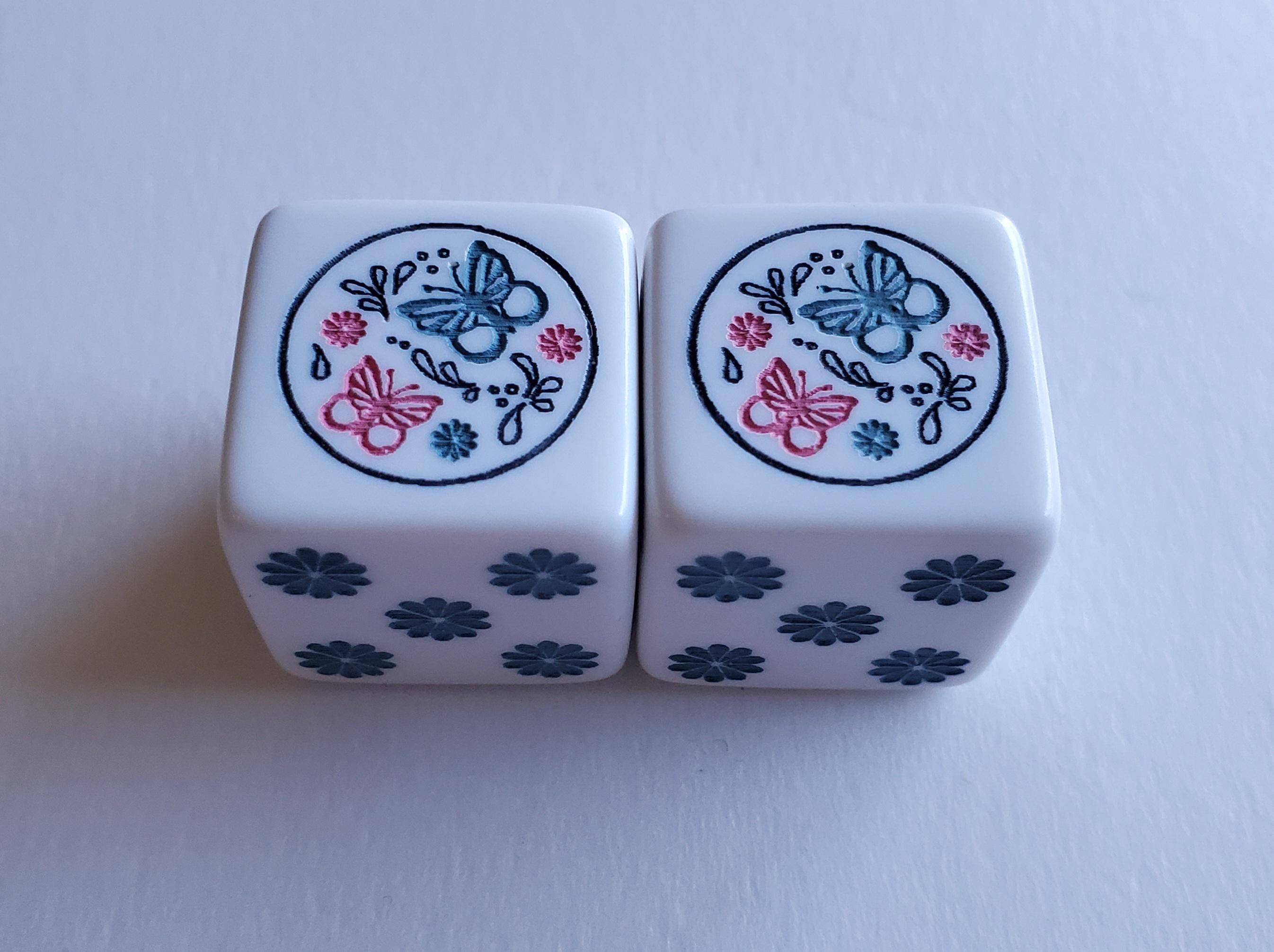 One pair of white in color dice. Hand painted in blue-gray, navy and pink. Pips are blue-gray.