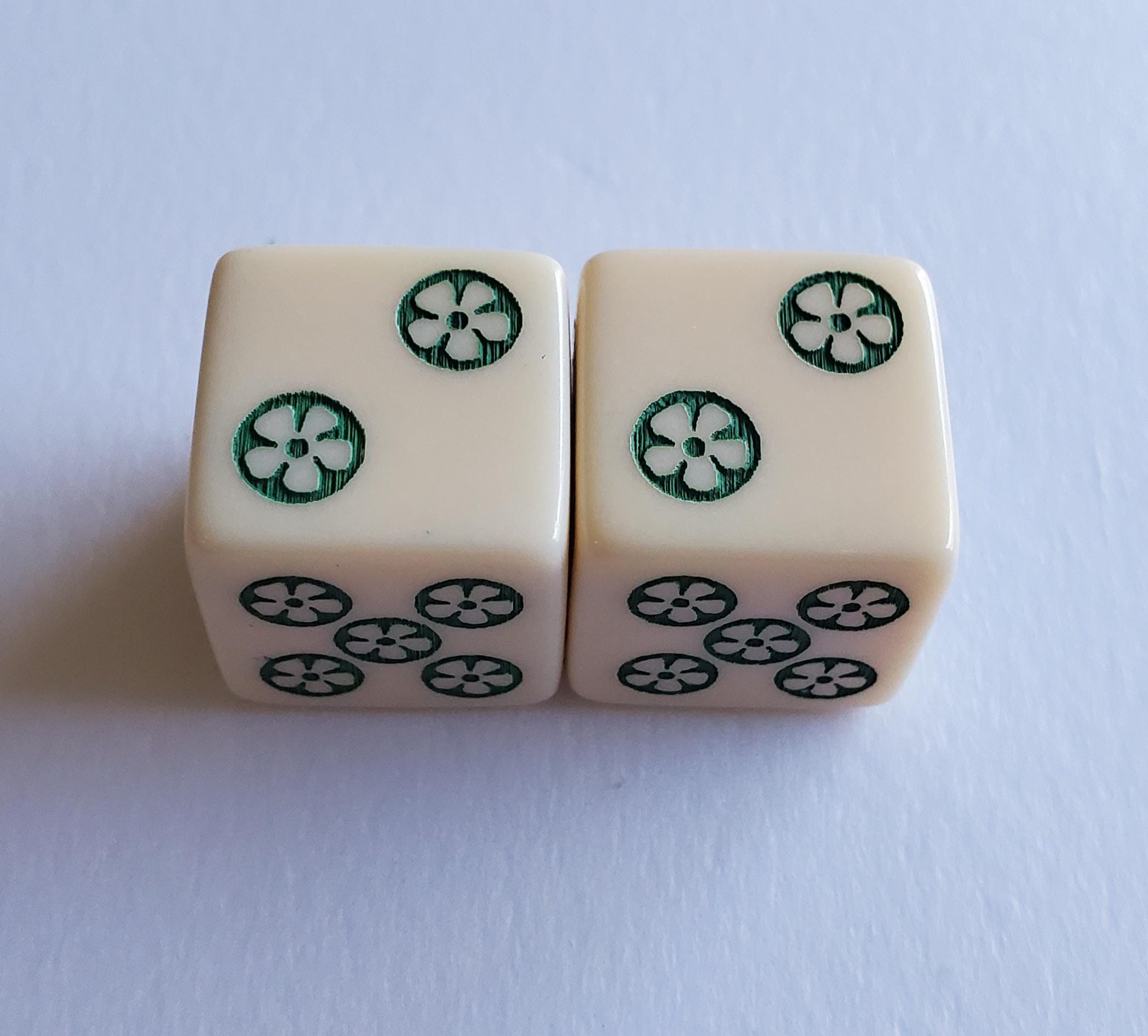 One pair of ivory color dice. Hand painted in blue, pink and green. Pips are green.
