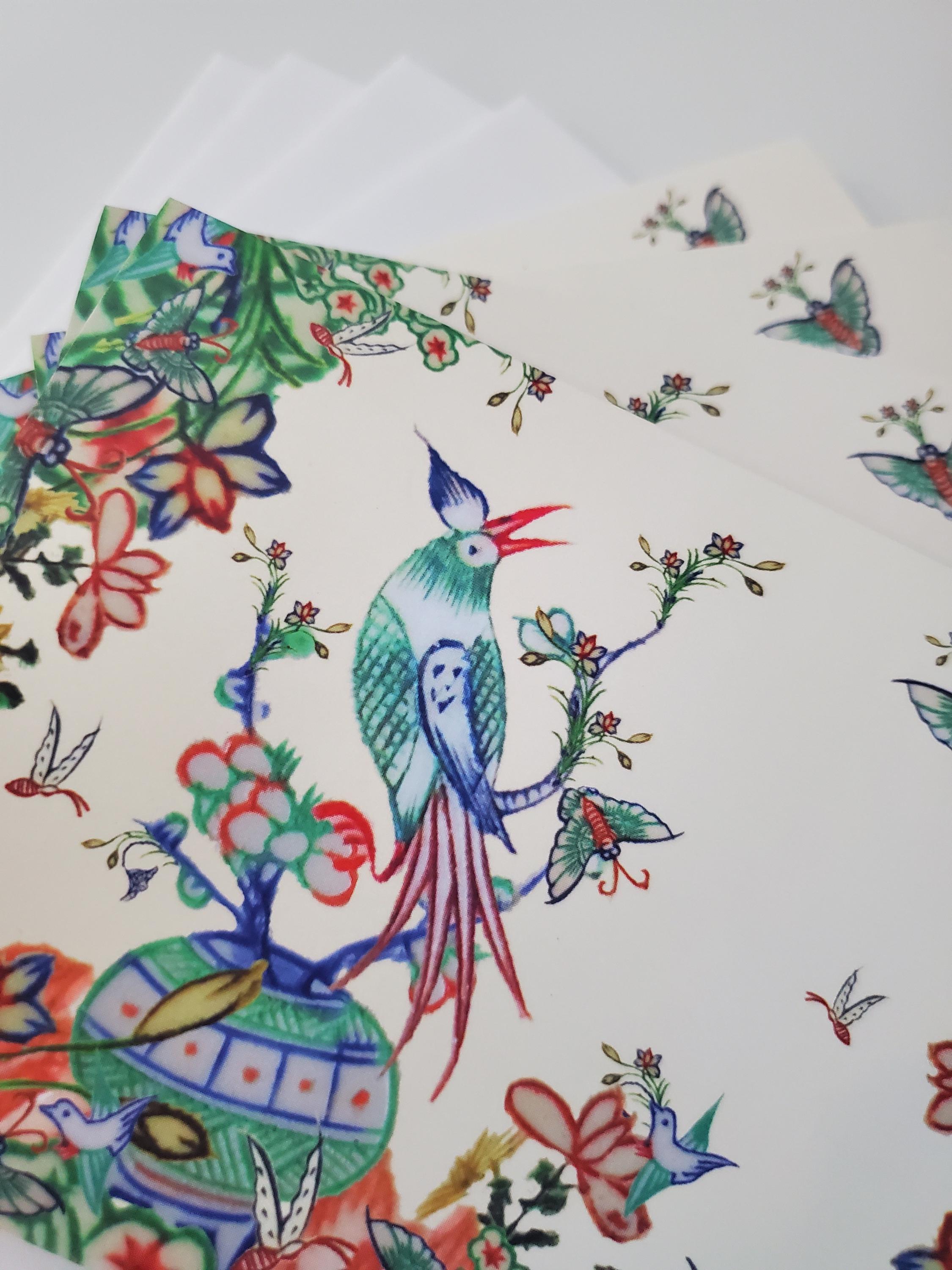 Four stationery cards and four envelopes. Four each of the same design: one bamboo bird in an imaginary mahjong-scape (all elements taken from vintage mahjong tiles). Folded card, image on the front side, blank interior and backside. Cardstock, 80-pound paperweight. White envelopes. Cards have a matte finish, easy for writing on the inside and backside. Cards and envelopes are wrapped together in a protective plastic envelope.