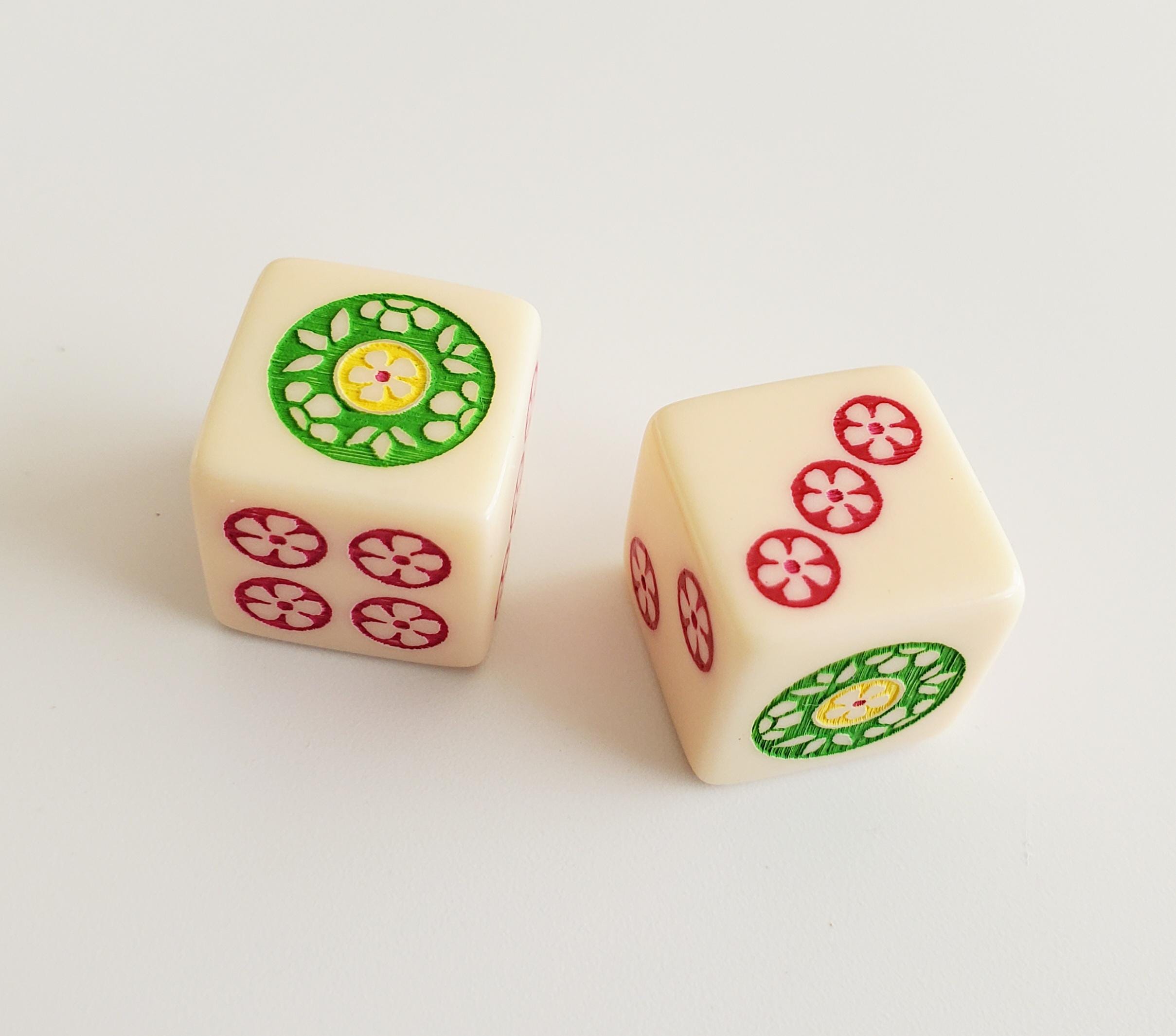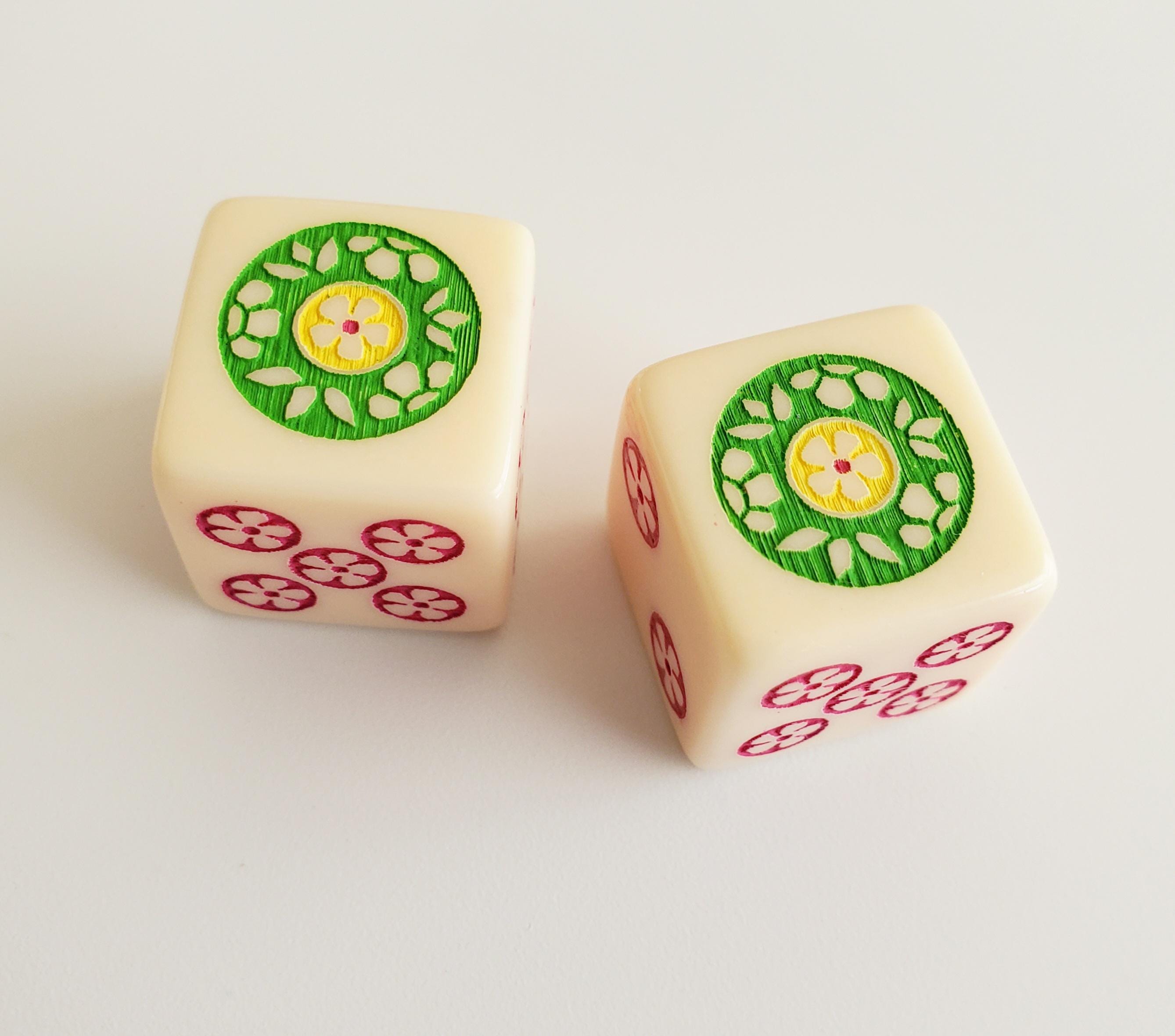 One pair of ivory color dice. Hand painted in green, yellow and magenta. Pips are magenta.
