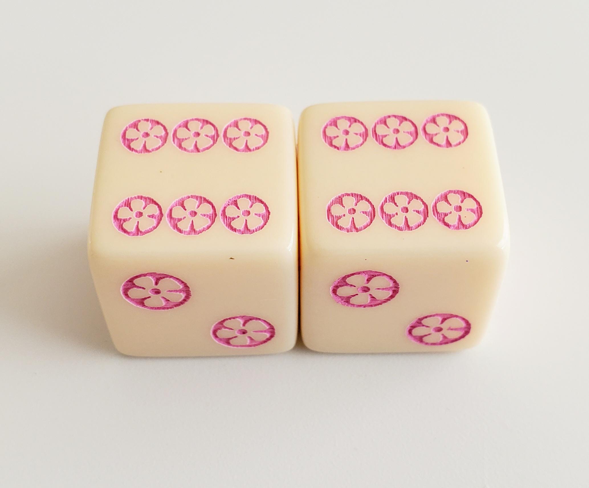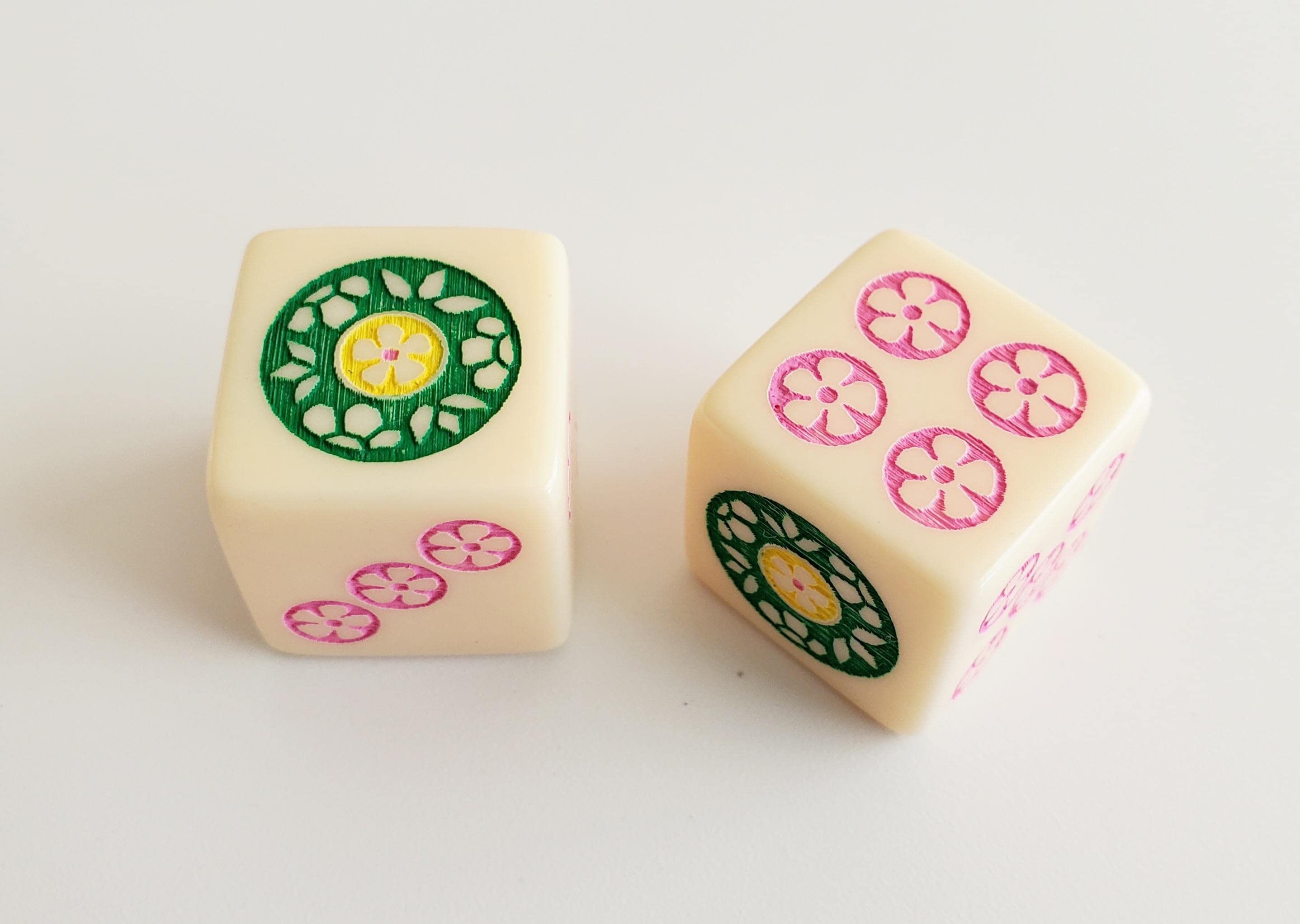 One pair of ivory color dice. Hand painted in green, yellow, and pink. Pips are pink.