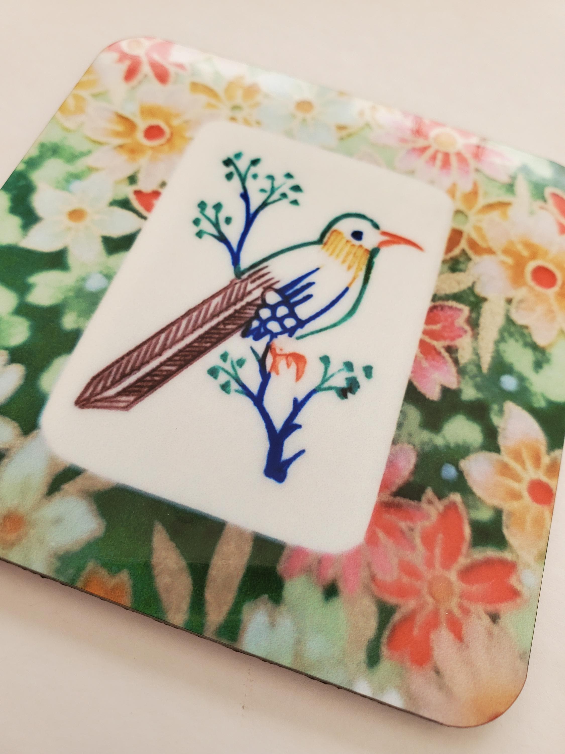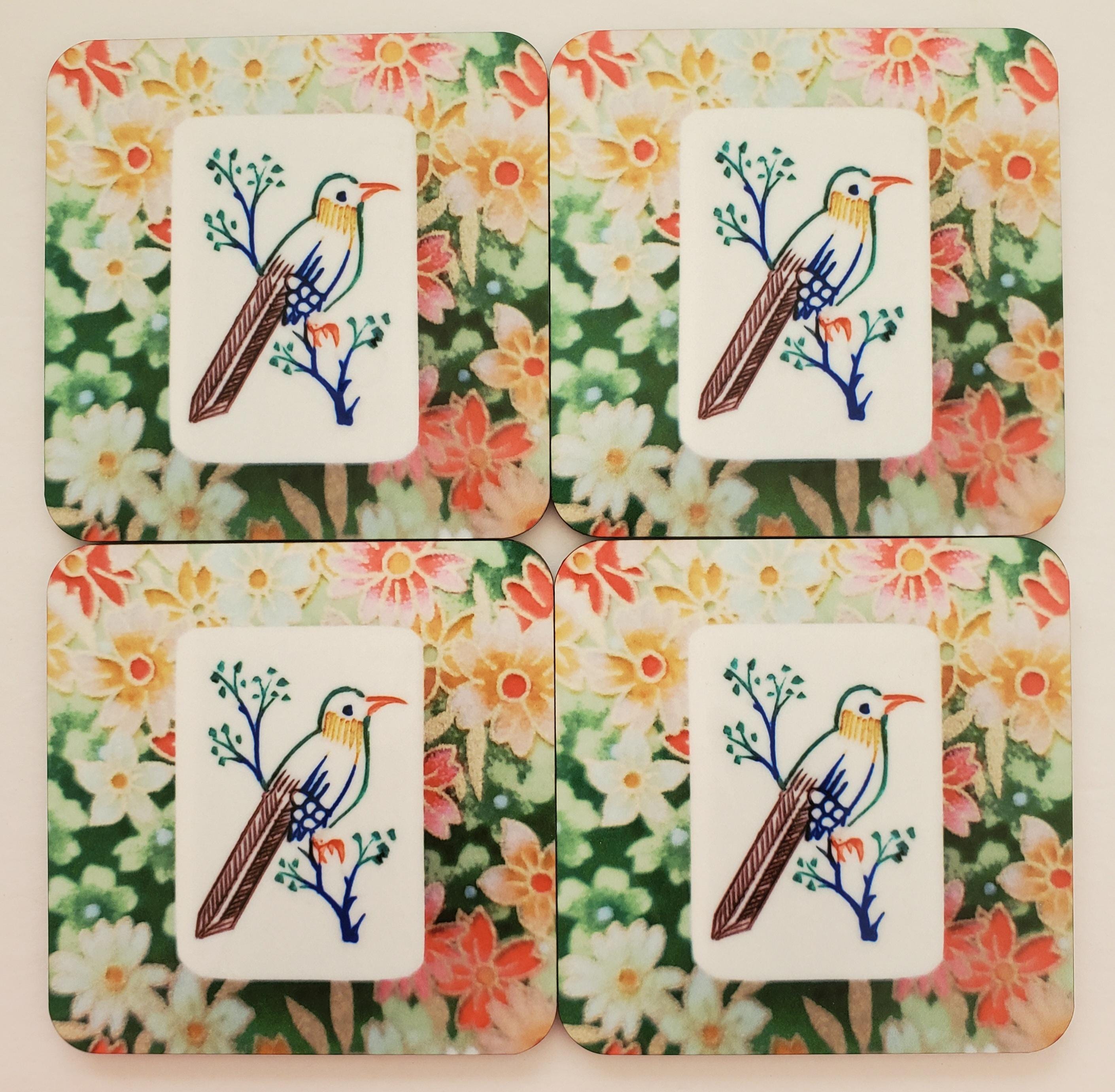 New - Set of four coasters with photograph of a one bamboo mahjong tile on a floral background design. Cork backing and an easy-clean high-gloss finish.