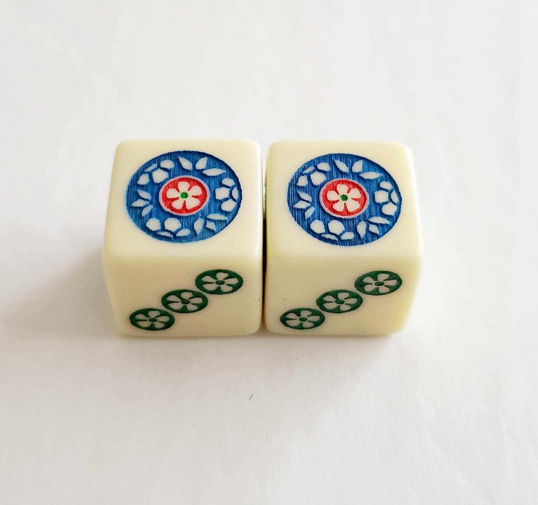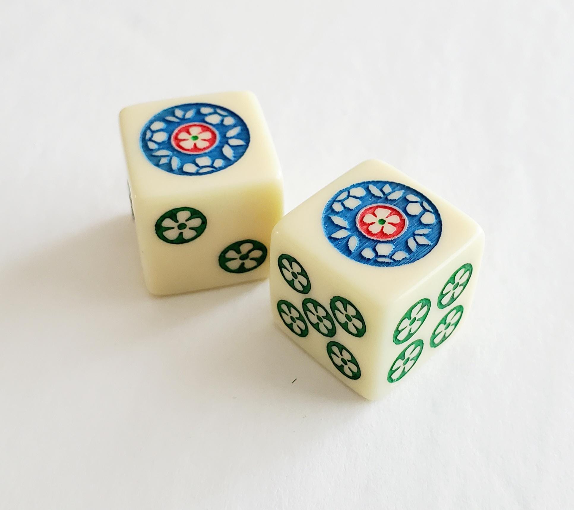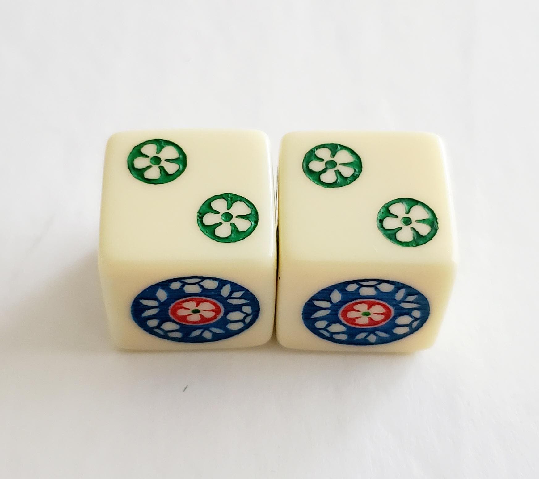 One pair of ivory color dice. Hand painted in green, blue and red. Pips are green.