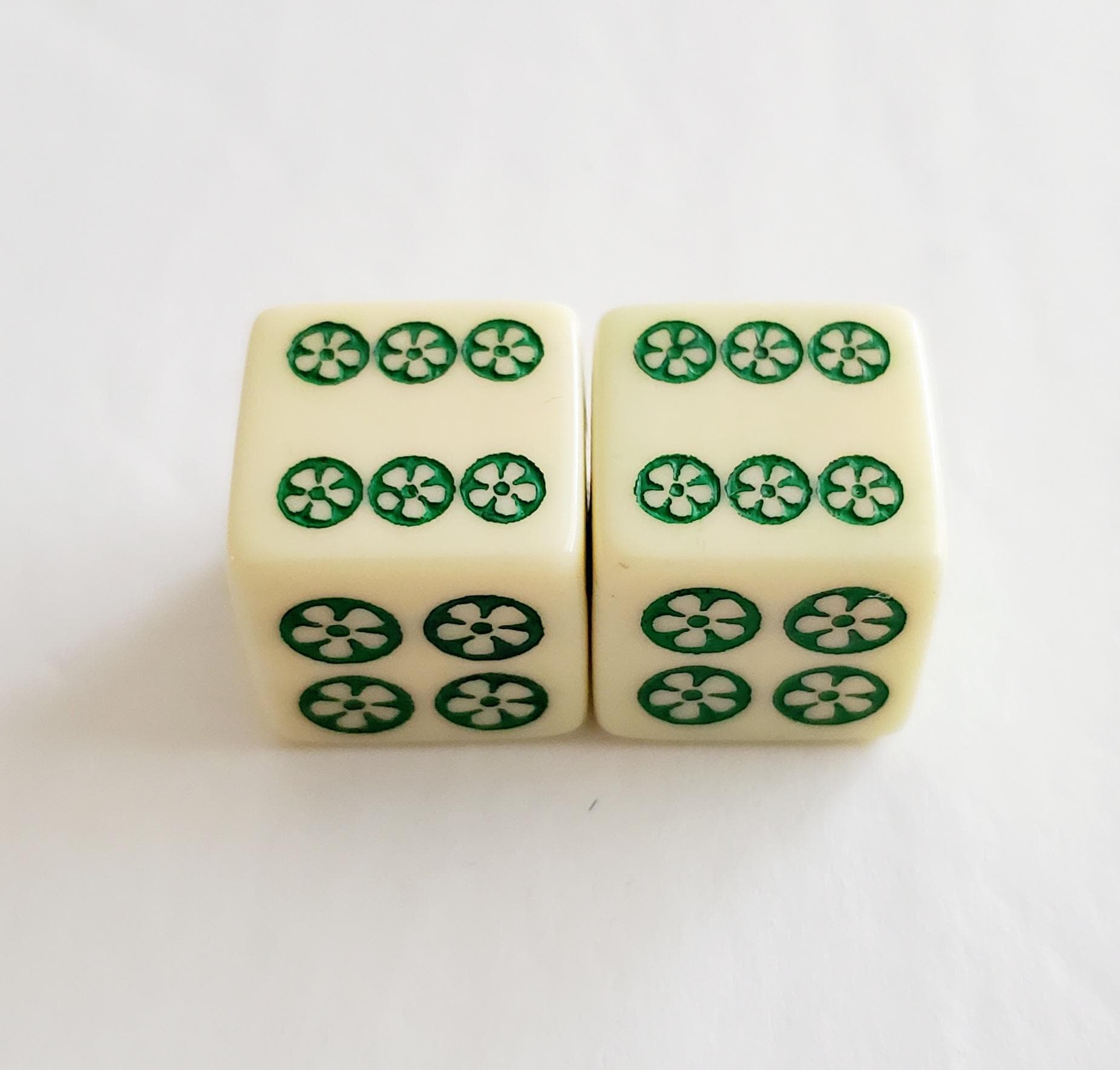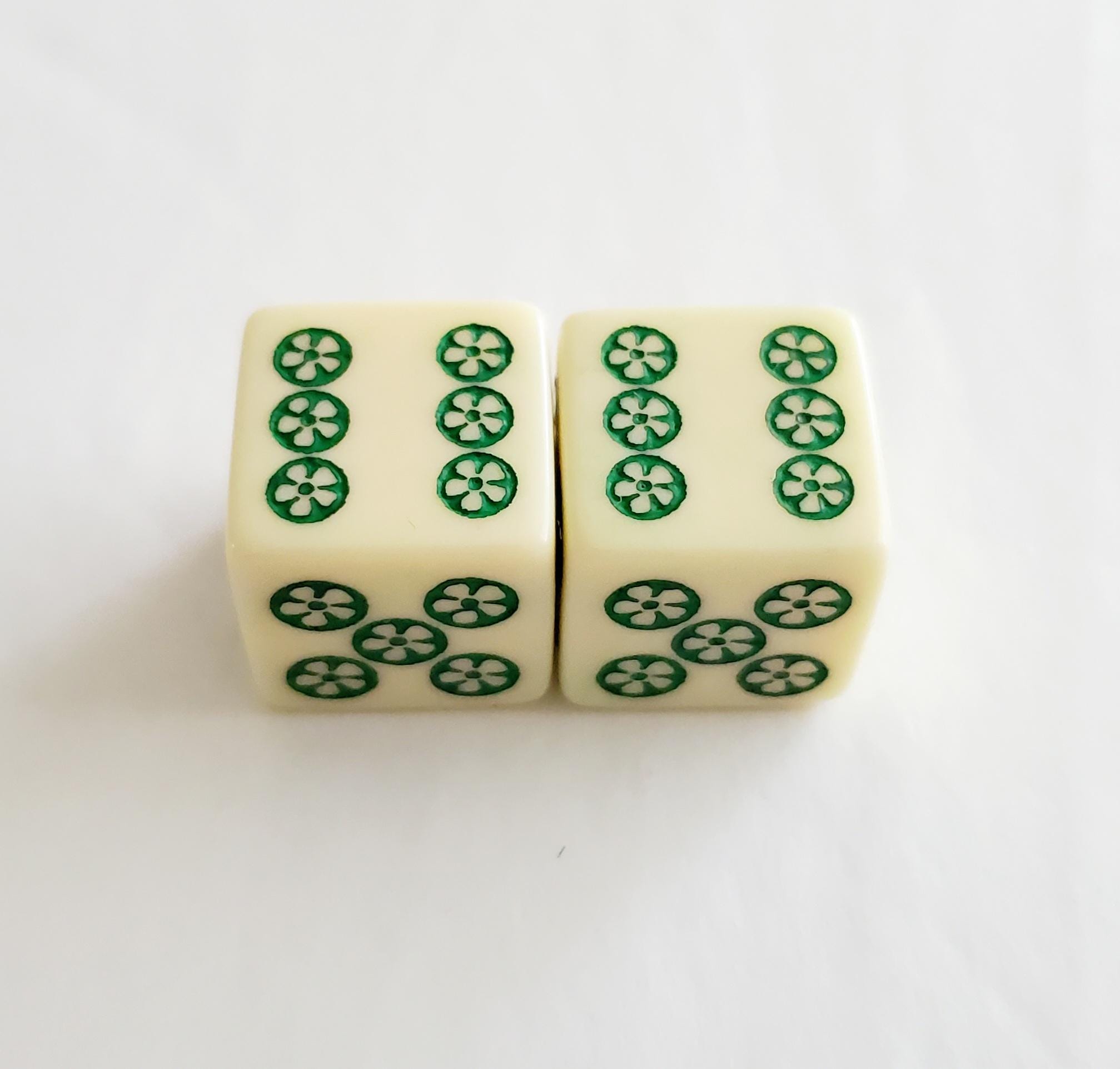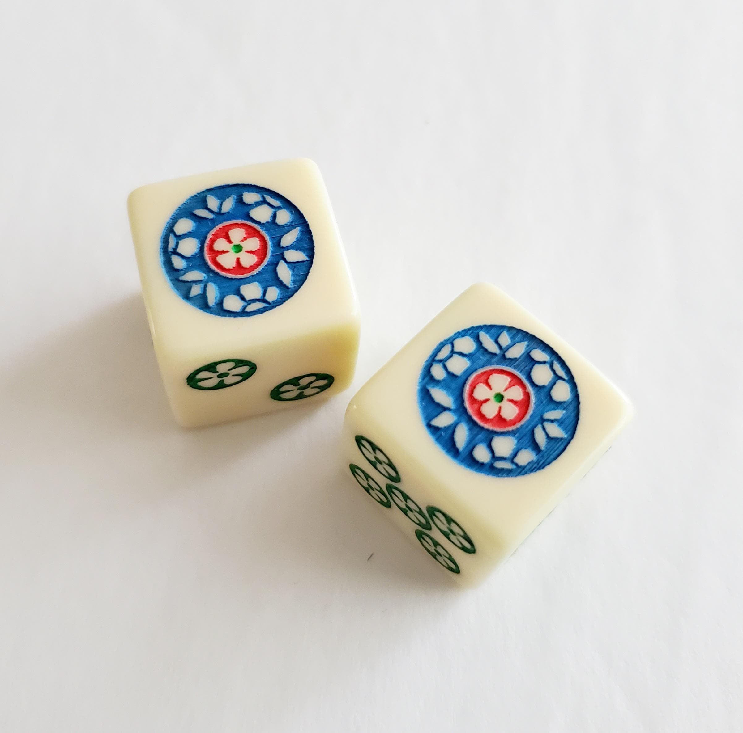 One pair of ivory color dice. Hand painted in green, blue and red. Pips are green.